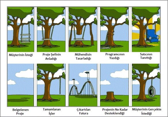 Aşağıda linkini verdiğim makale, meseleye farklı bir açıdan bakmamı sağladı. Zorluk belki de ilk tanımın ne kadar doğru ve eksiksiz yapılıp yapılmadığı değil; bundan daha derin. Müşteri projenin bir sorununa çözüm olmasını istiyor. Bu amaçla tasarlamaya çalıştığı çözüm, analize dönüşüyor. Proje ekibi, bu çözümü tam ve eksiksiz gerçeklediğinde projeyi başarılı kabul ediyor. Ancak, projenin gerçekten başarılı olabilmesi için analize konu olan çözümü gerçeklemesi değil; müşterinin sorununu çözmesi lazım. Bu iki nokta arasında da kimi zaman küçük, kimi zaman büyük bir fark var.